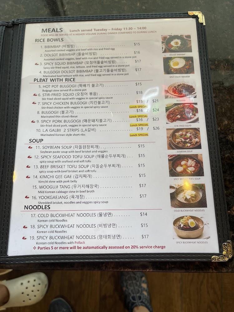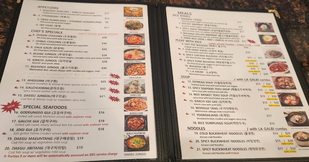 The restaurant also offers various appetizers like seafood pancakes and tteokbokki, perfect for sharing. Diners can enjoy unique chef specials or choose from combo sets ideal for different group sizes.
